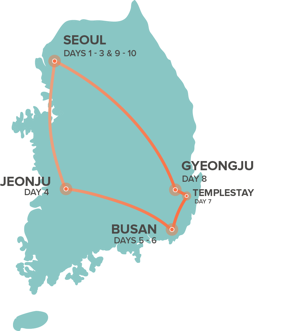 De Zuid-Korea Adventure groepsreis is een 10-daagse jongerenreis die start en eindigt in Seoul. In tien dagen ontdek je de perfecte mix van moderne steden, stranden en eeuwenoude tradities. Je bezoekt paleizen, tempels en hanokdorpen, proeft streetfood op kleurrijke markten en reist met de hogesnelheidstrein naar plaatsen als Jeonju, Busan en Gyeongju. Van een kookworkshop en een Taekwondo-les tot een tempelovernachting en een K-pop ervaring. Elke dag brengt een nieuw avontuur!